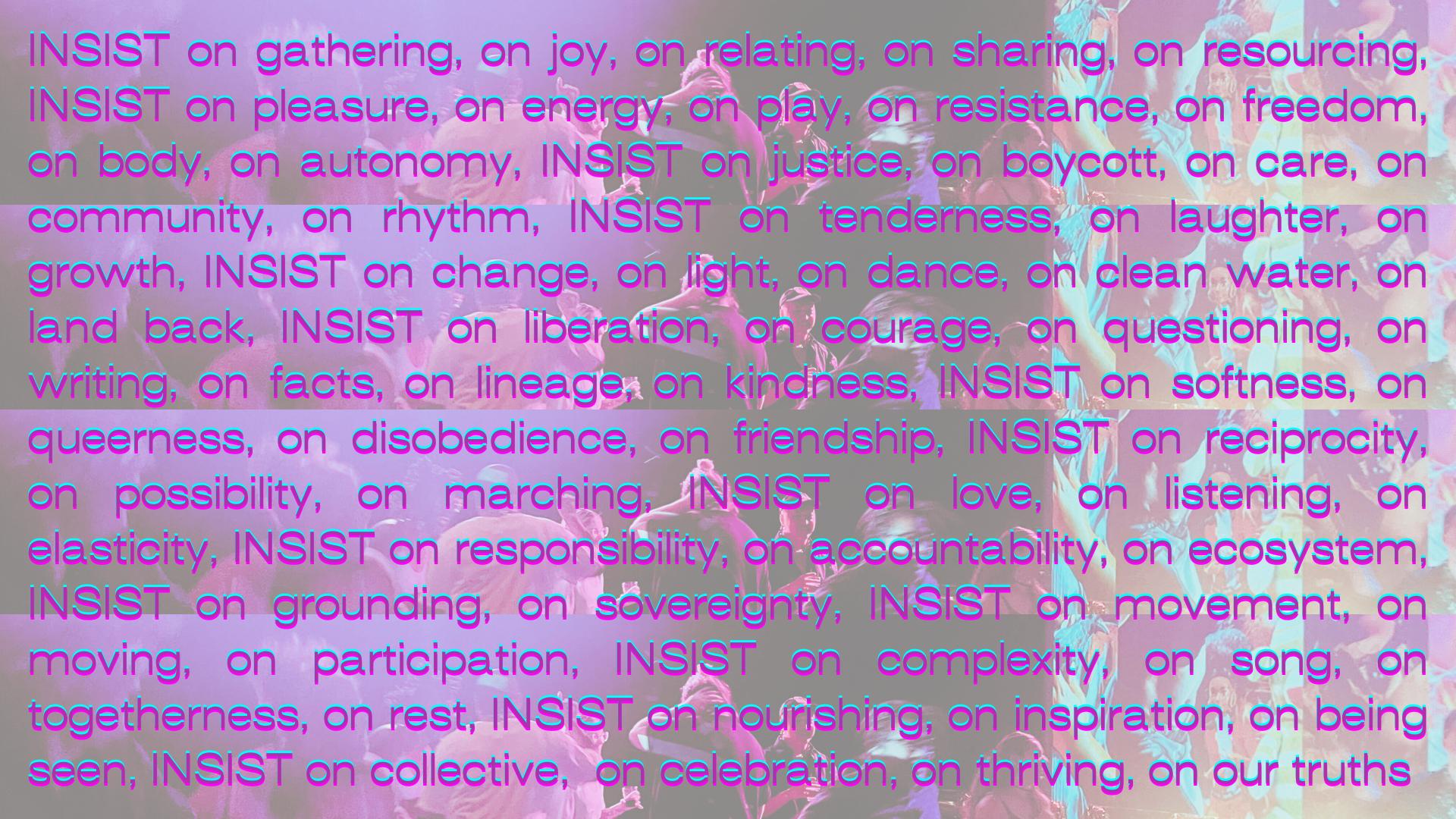 INSIST on gathering, on joy, on relating, on sharing, on resourcing, INSIST on pleasure, on energy, on play, on resistance, on freedom, on body, on autonomy, INSIST on justice, on boycott, on care, on community, on rhythm, on tenderness, on laughter, on growth, INSIST on change, on light, on dance, on clean water, on land back, INSIST on liberation, on courage, on questioning, on writing, on facts, on lineage, on kindness, on softness, on queerness, on disobedience, on friendship, INSIST on reciprocity, on possibility, on marching, INSIST on love, on listening, on elasticity, on responsibility, on accountability, on ecosystem, on grounding, on sovereignty, on movement, on moving, on participation, INSIST on complexity, on song, on togetherness, on rest, on nourishing, on inspiration, on being seen, INSIST on collective, on celebration, on thriving, on our truths