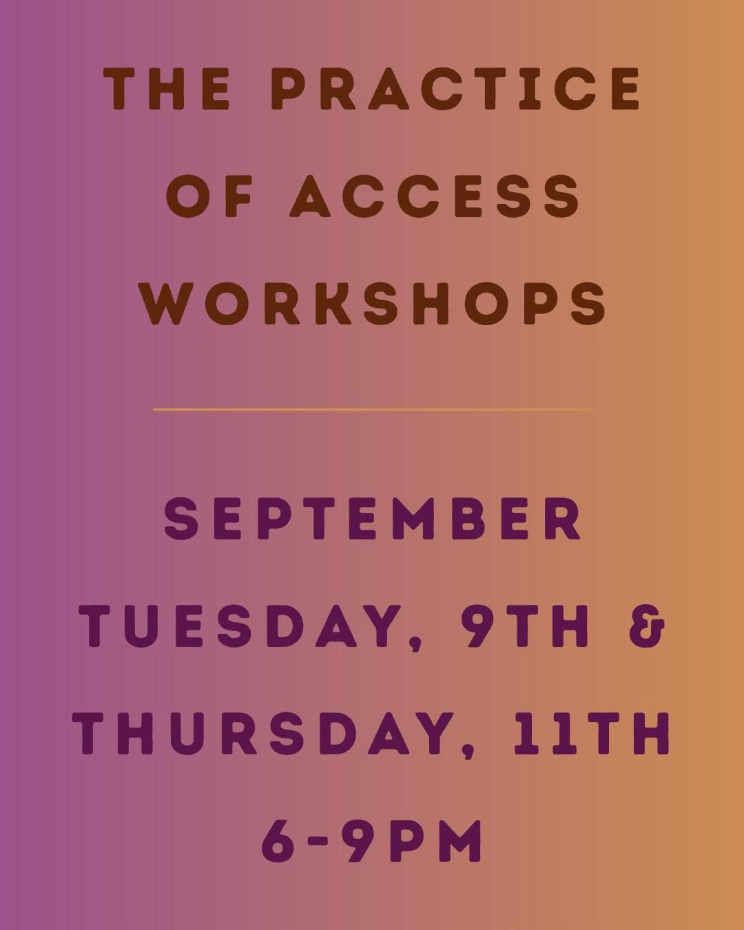 Image Description: Against a gradient background with colors shifting from left to right in shades of purple and gold, text in earth tone brown reads “The Practice of Access Workshops”. A thin horizontal gold line separates this text from dark purple lettering below that reads “September, Tuesday, 9th & Thursday, 11th, 6 - 9pm”